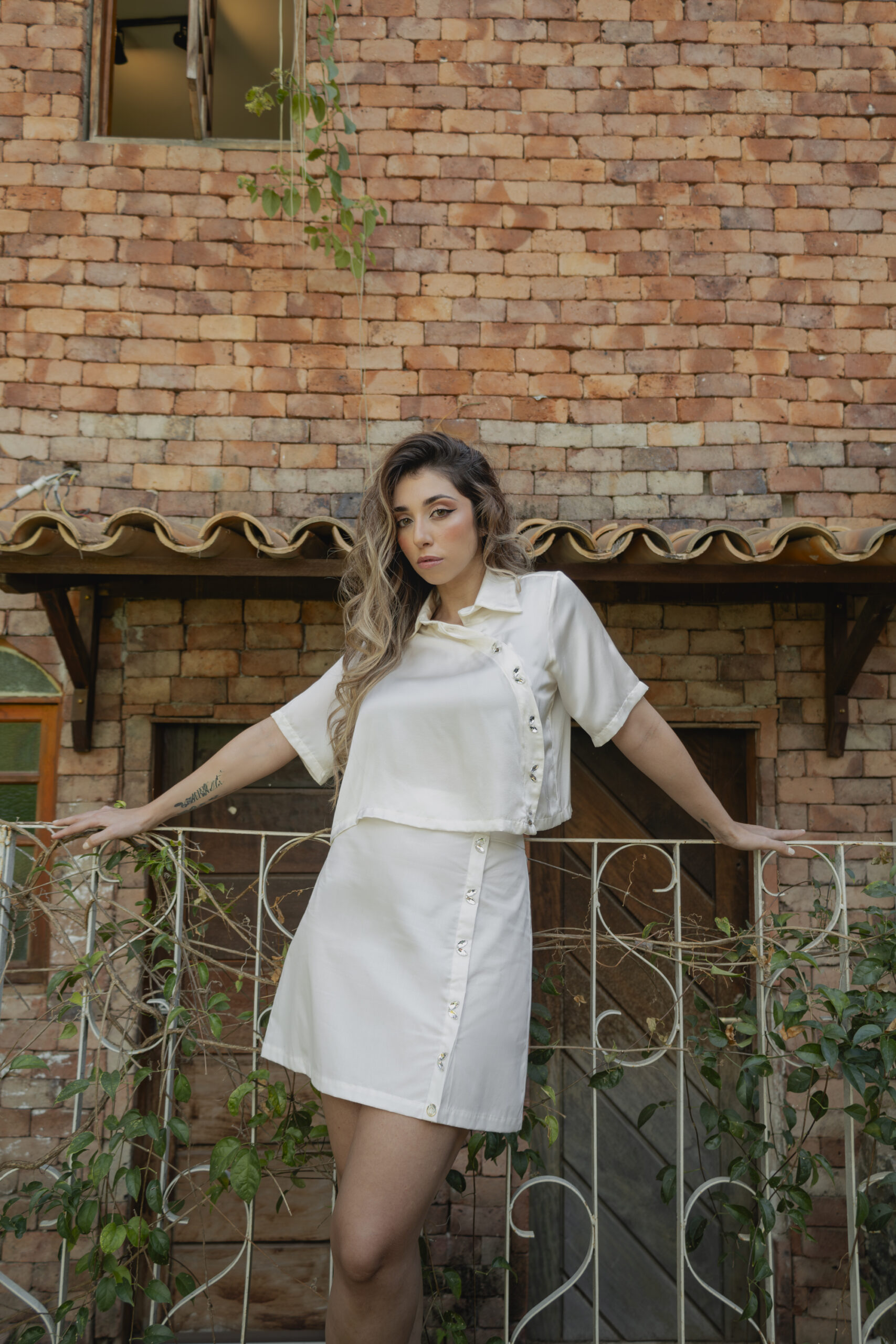 Semi Cropped fabricado em Cetim de Seda, comprimento abaixo do umbigo, gola tipo camisa, abotoamento invisível que vai na diagonal e desce e no viés do abotoamento bordado em pedrarias feito a mão.