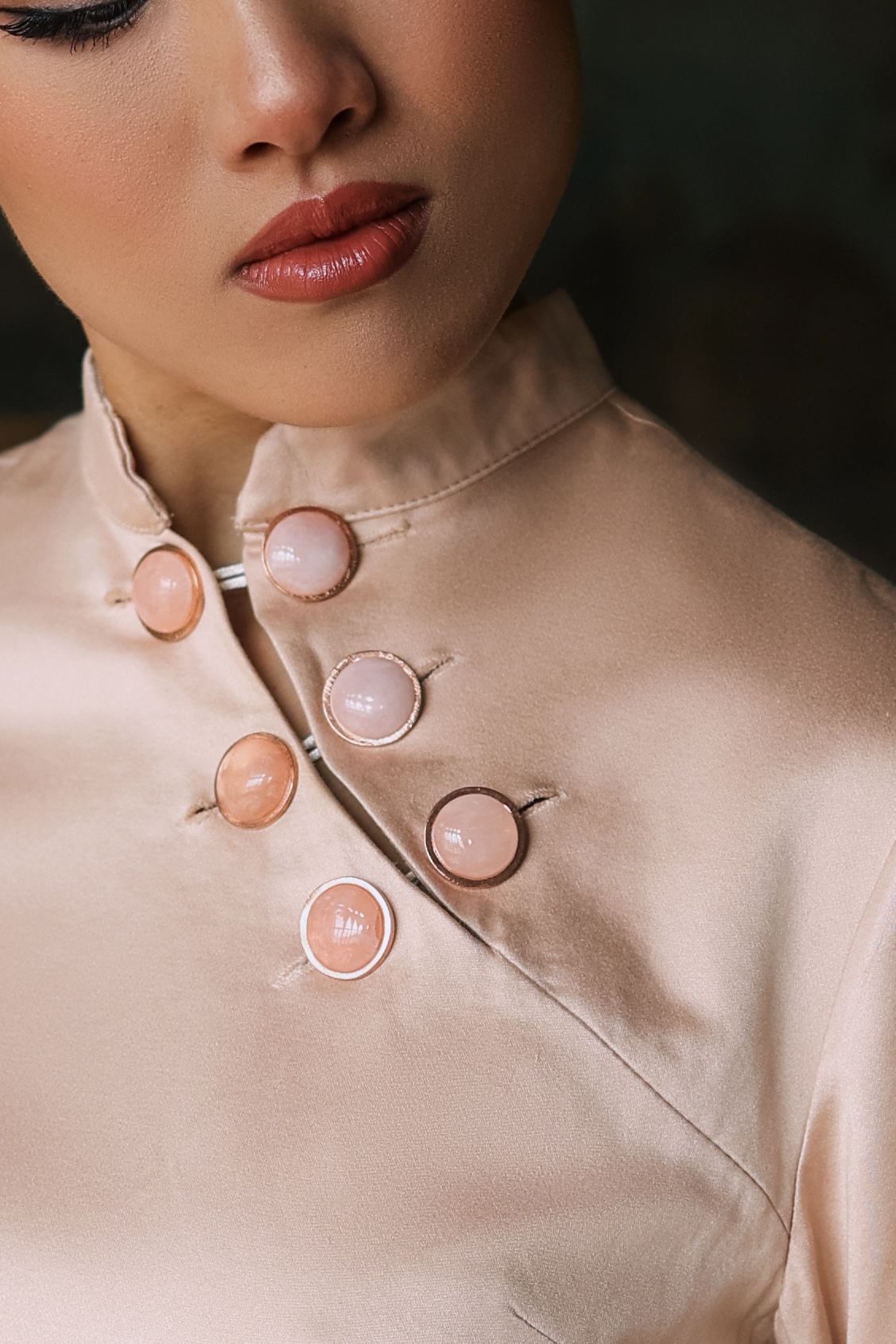 Blusa de manga longa feita em teccido modal com algodão em acabamento acetinado. Punhos tipo camisa e abotoamento tartaruga na gola com botões em pedra natural.