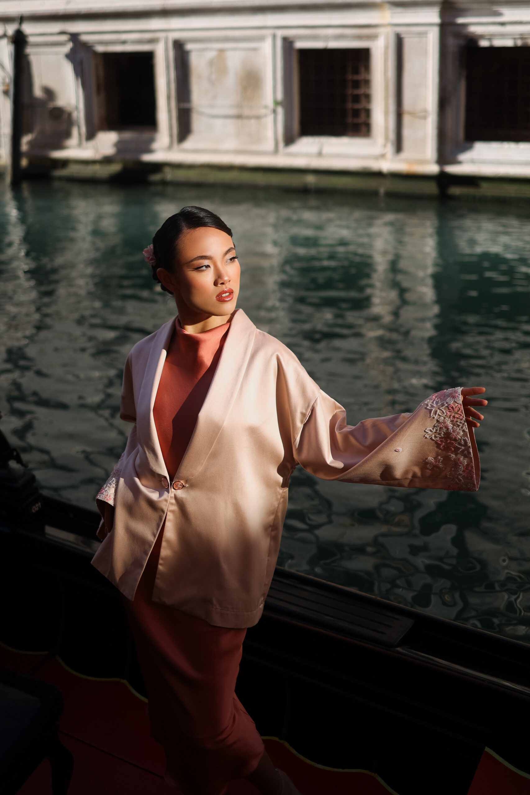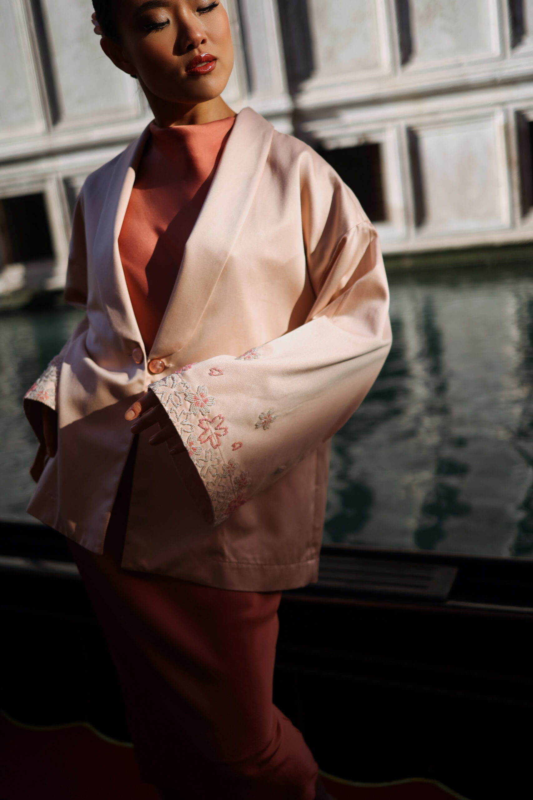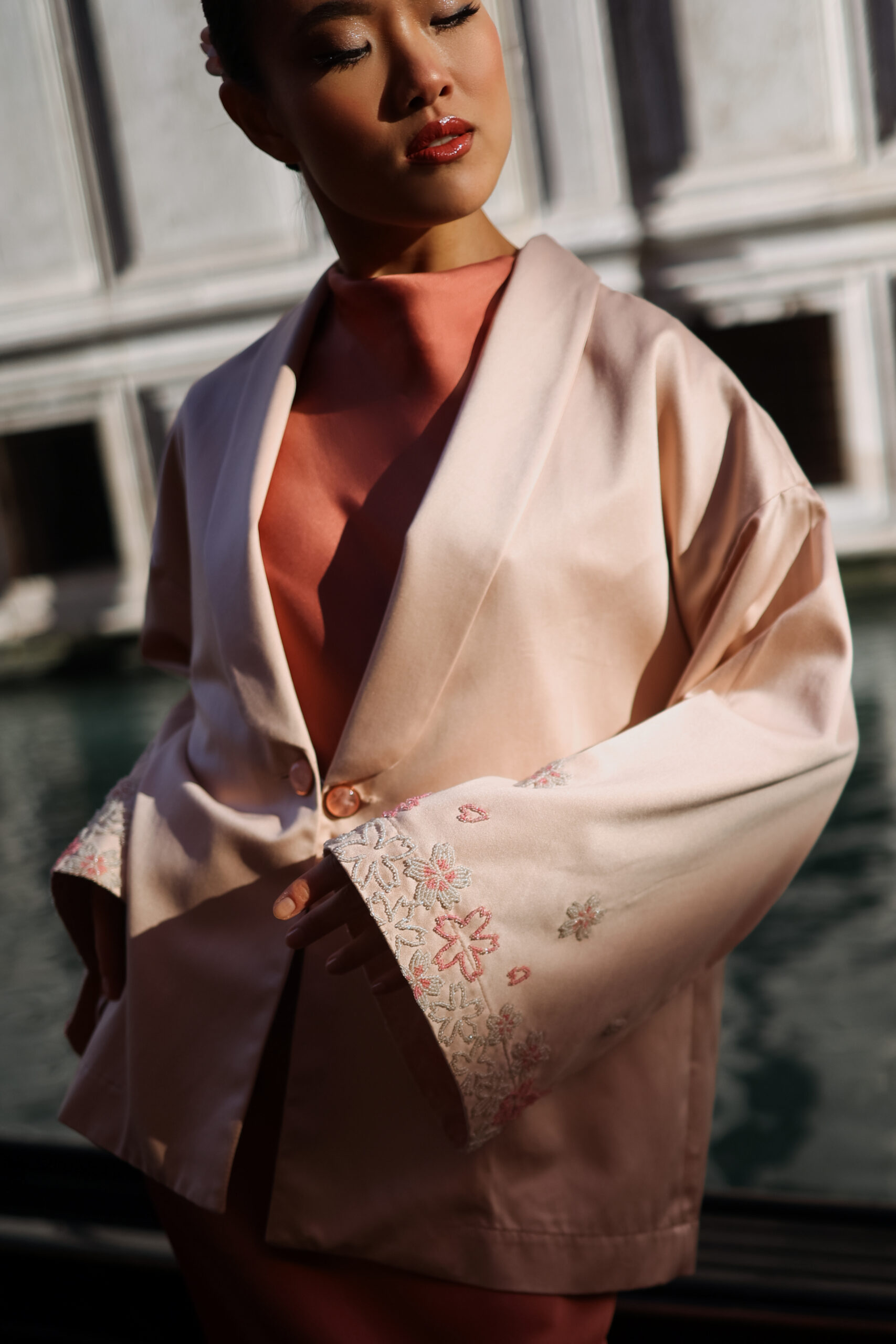 Kimono com lapela de blazer, feito em tecido 100% de fibras naturais com acabamento acetinado, abotoamento tartaruga com botões em pedras naturais e bordados em pedrarias nas mangas que remetem às flores de cerejeira.