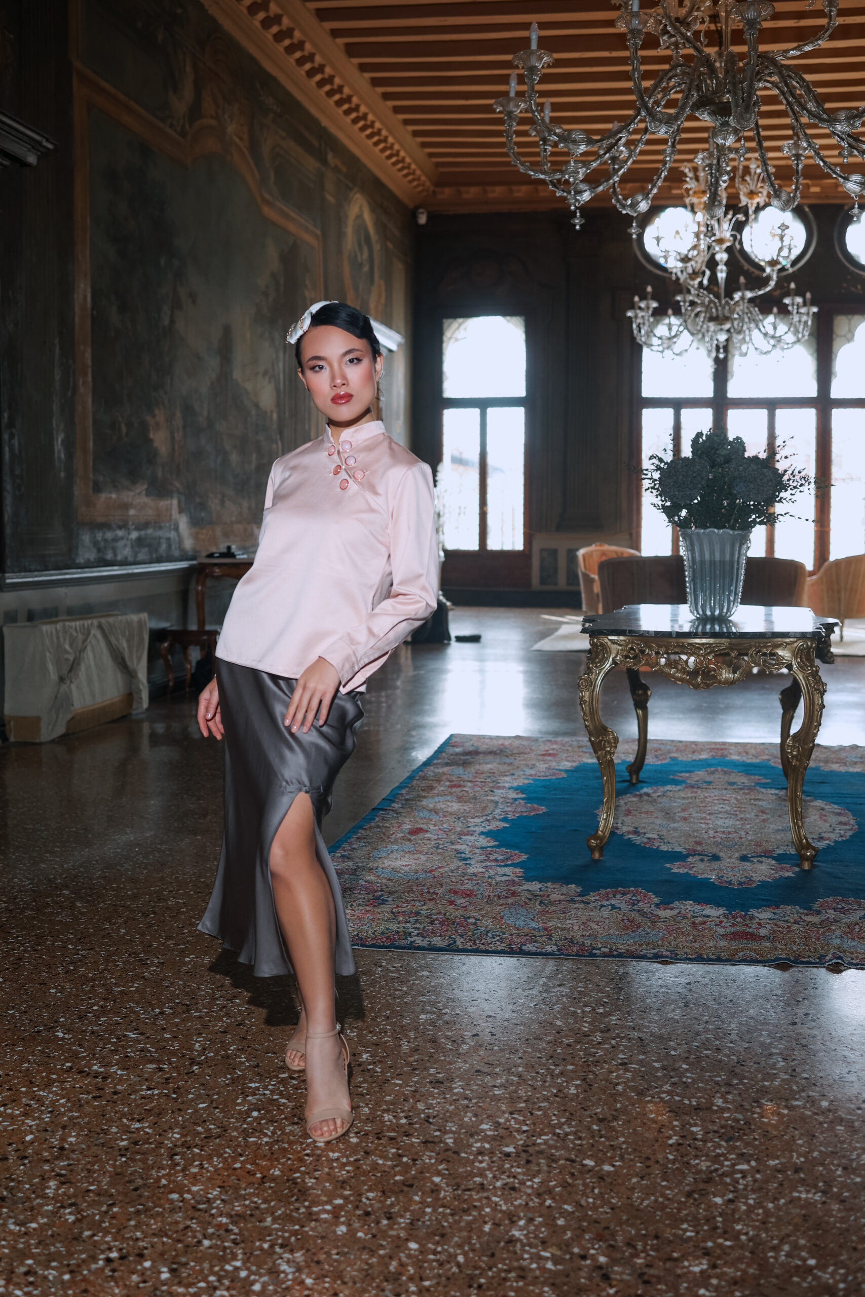 Saia de comprimento midi e modelo evasè, confeccionada em tecido 100% seda, sua modelagem destaca a linha da cintura e abre nas pontas dando fluidez. Com um toque sexy, essa peça super elegante e coringa, tem uma fenda na lateral esquerda, que finaliza com um botão chinês no topo.