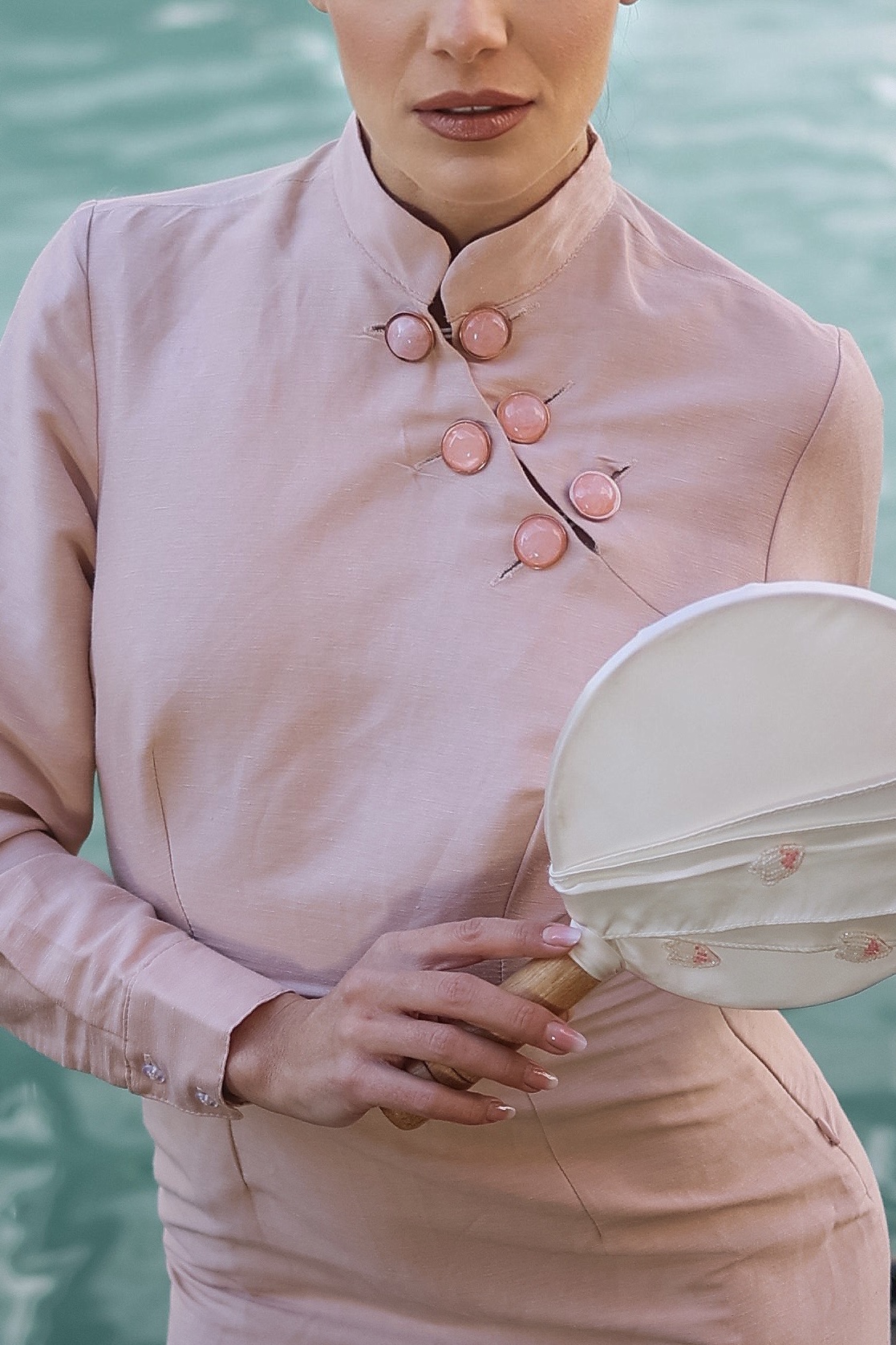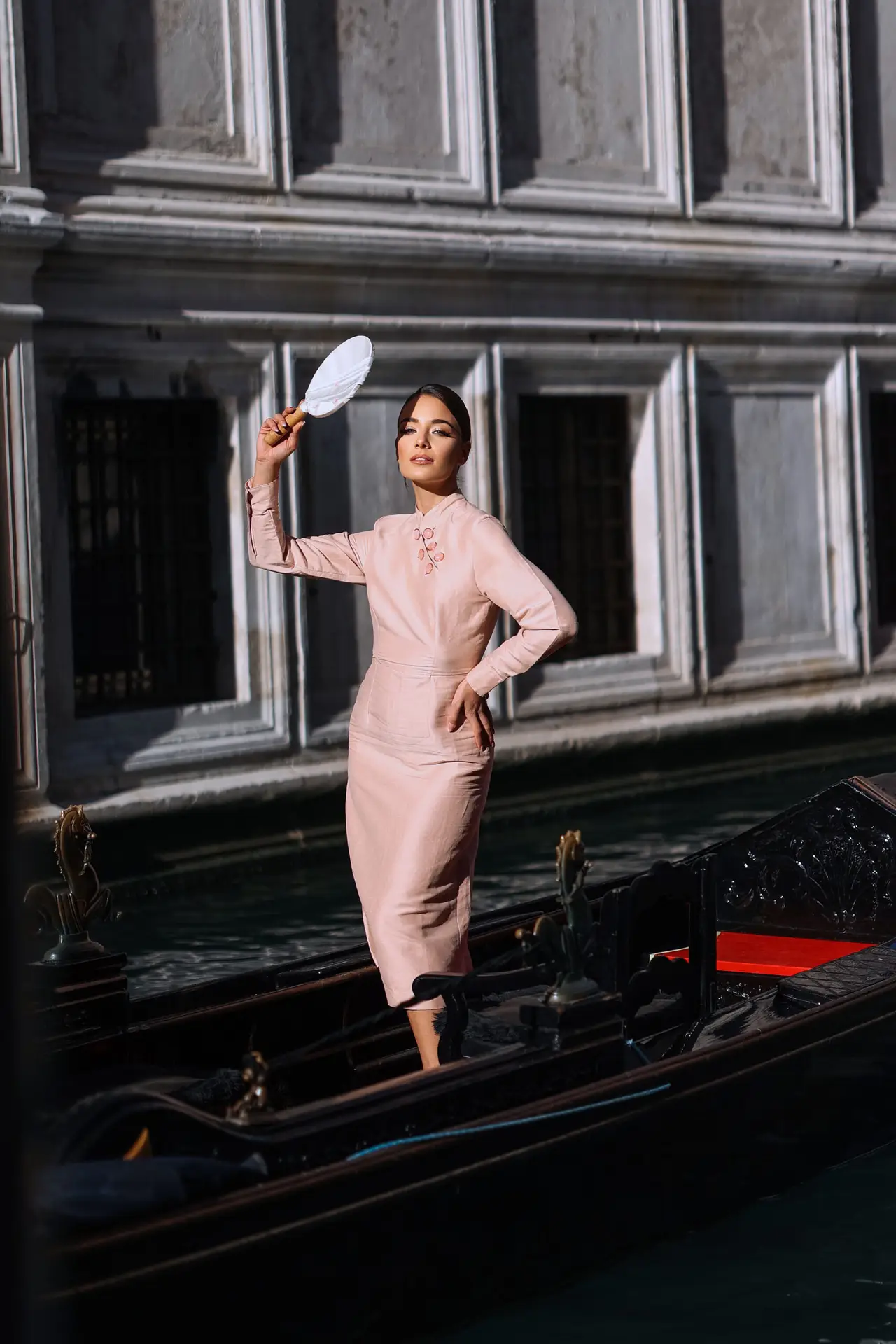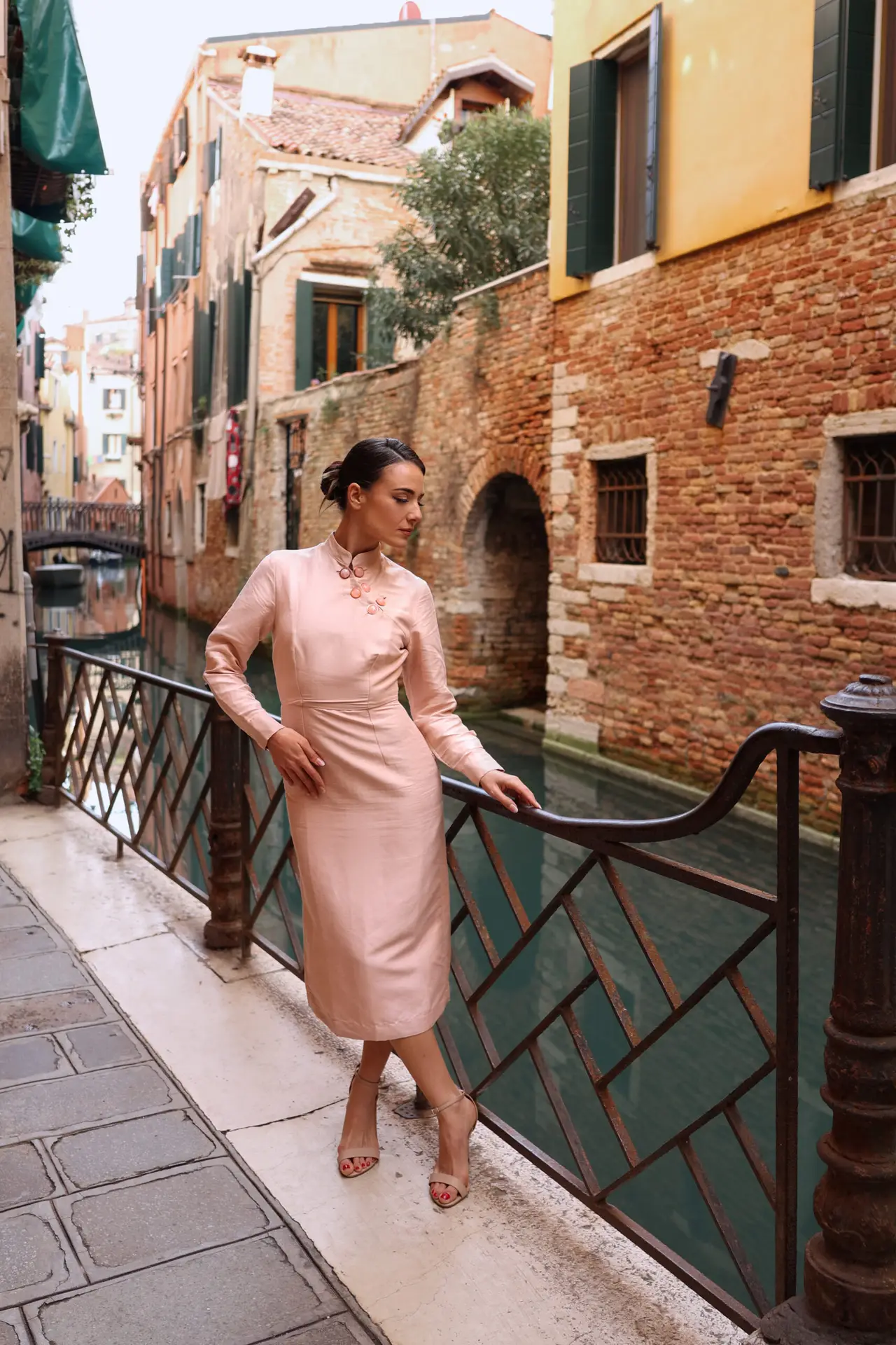 Vestido de comprimento midi, manga longa tipo camisa e saia de modelagem lápis. Gola com abertura para a diagonal esquerda e fechamento com botões em pedra natural